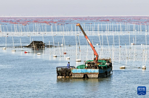 眼下,江蘇連云港市海州灣漁場養(yǎng)殖區(qū)的頭茬條斑紫菜迎來收獲時節(jié),“海上菜園”到處都是搶收紫菜的繁忙景象。
