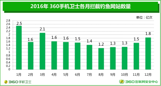 釣魚(yú)網(wǎng)站的活躍期也存在差異。360專(zhuān)家表示,綜合2016年各月的釣魚(yú)網(wǎng)站攔截量情況,可以看出全年的釣魚(yú)網(wǎng)站活躍程度呈現(xiàn)中間低、兩頭高的特點(diǎn)。1月份釣魚(yú)網(wǎng)站攔截量最高,達(dá)到2.5億,8月最低(1.2億次)。