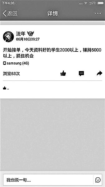 13日,記者調(diào)查發(fā)現(xiàn),在一些借款群中,女大學生“裸持”借款已經(jīng)成為公開的秘密,通過“裸持”可以借款的金額是普通借款額度的2至5倍,但逾期未還將面臨裸照被公布的威脅,甚至有借款人威脅“裸持”借款的女生提供性服務(wù)。