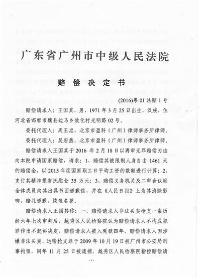 7年前,因在廣州市越秀區(qū)一德路賣(mài)20支仿真槍?zhuān)颖比送鯂?guó)其被控非法買(mǎi)賣(mài)、運(yùn)輸槍支罪,并坐了4年牢。今年2月底,他在獲得了越秀區(qū)檢察院的無(wú)罪認(rèn)定后,申請(qǐng)了國(guó)家賠償。近日,廣州市中級(jí)人民法院作出決定,賠償王國(guó)其人身自由損害賠償金共計(jì)35 .4萬(wàn)元,精神損害撫慰金8萬(wàn)元,并在侵權(quán)行為影響范圍內(nèi)為其消除影響、恢復(fù)名譽(yù)、賠禮道歉。對(duì)于這個(gè)結(jié)果,王國(guó)其說(shuō),不想再折騰了,希望能盡快回歸正常生活。