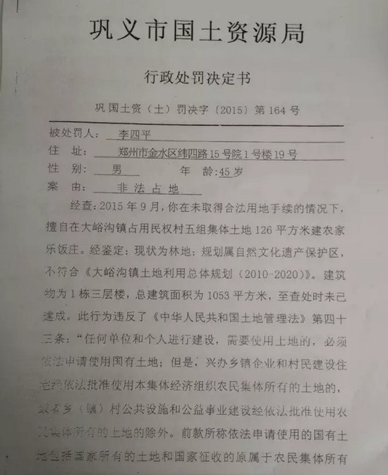 據(jù)記者獲取的材料顯示,2015年12月份,鞏義市國(guó)土資源局對(duì)李四平進(jìn)行處罰,案由為“非法占地”。李四平擅自占用集體土地126平方米,建設(shè)農(nóng)家樂(lè),土地性質(zhì)為林地。對(duì)其處罰為“自行拆除在非法占用的126平方米土地上新建的建筑物和其他設(shè)施,恢復(fù)土地原狀”“對(duì)非法占用的126平方米土地,按每平方米3元處以罰款,共378元?!?/p>