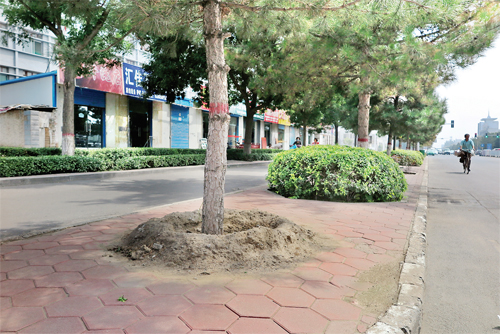 近日,記者途經城區(qū)長征西街建設路口時,發(fā)現(xiàn)在道路北側的綠化帶內,有的行道樹樹坑只是用土堆進行了簡單的堆砌,時值秋雨多發(fā)時期,在雨天極易造成一定程度的水土流失。希望市政管理部門能夠引起重視,早日為樹坑穿上一件“金鐘罩”。(王君 攝)