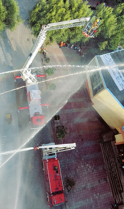 9月26日,在忻州師范學(xué)院內(nèi),當(dāng)?shù)叵啦块T舉行了國慶節(jié)前應(yīng)急疏散演練,其中包括滅火器材使用、火場逃生自救等演練項目。(樊晶璟 攝)
