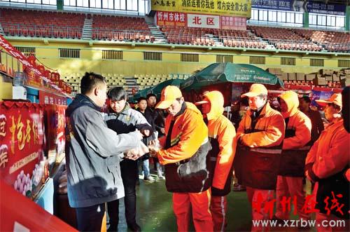 1月19日上午,山西熊奪寶網(wǎng)絡(luò)科技有限公司面向忻州市環(huán)衛(wèi)系統(tǒng)開展“獻(xiàn)愛心迎佳節(jié)”活動(dòng),來自忻州市市容環(huán)境衛(wèi)生管理處的50名環(huán)衛(wèi)工人代表,每人領(lǐng)到了一份新鮮雞蛋?,F(xiàn)場的一位工作人員告訴記者:“環(huán)衛(wèi)工人們?yōu)榱顺鞘械母蓛粽麧嵏冻隽诵燎诘暮顾?,希望這些雞蛋能為他們補(bǔ)補(bǔ)身體。除現(xiàn)場領(lǐng)取雞蛋的50名環(huán)衛(wèi)工人之外,我市另外的1000多名環(huán)衛(wèi)工人也將陸續(xù)領(lǐng)到愛心雞蛋?!鳖I(lǐng)到雞蛋的環(huán)衛(wèi)工李大姐高興地說:“今年過年雞蛋也不用買了,實(shí)在是太好了!”(王菲 郭劍鳴 攝)