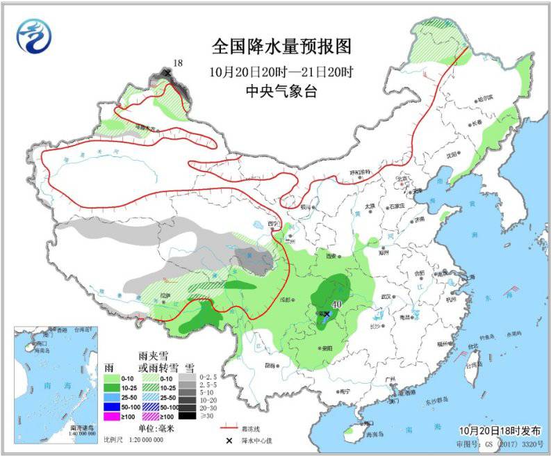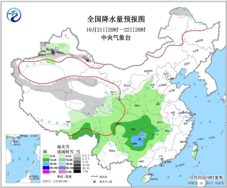10月20日20時(shí)至21日20時(shí),新疆北疆北部和西部、青海南部、西藏北部、內(nèi)蒙古東北部、黑龍江西北部等地的部分地區(qū)有小到中雪或雨夾雪,其中,北疆北部山區(qū)有大到暴雪(10~18毫米)。西藏東南部、陜西南部、四川盆地東部、重慶大部、貴州北部等地的部分地區(qū)有中到大雨(10~40毫米)。內(nèi)蒙古東部、東北地區(qū)北部、新疆北部、西藏北部等地的部分地區(qū)有4~6級(jí)風(fēng),新疆山口風(fēng)力可達(dá)10級(jí)左右(見圖1)。