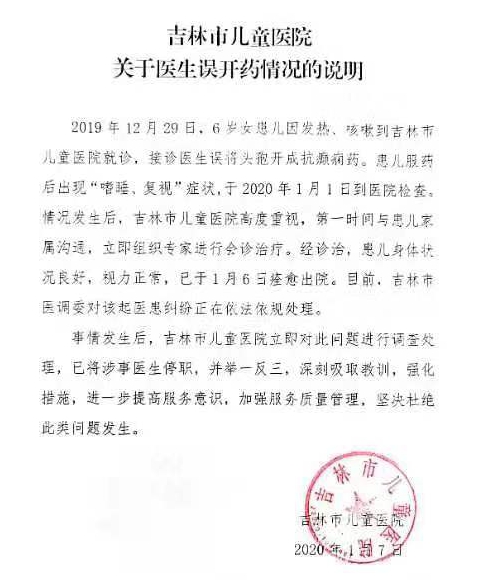 醫(yī)生誤開藥致女童復(fù)視 吉林市兒童醫(yī)院:涉事醫(yī)生已停職