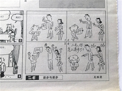 一個(gè)孩子考了100分,受到表揚(yáng)。后來考了98分,結(jié)果被打了耳光;另一孩子考了55分,被打了耳光。第二次考了61分,卻受到表揚(yáng):這幅名為《進(jìn)步與退步》的四格漫畫,入選為2016年高考全國卷1的作文題目。