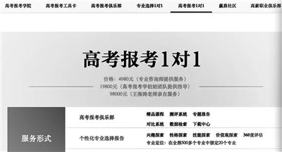 北青報(bào)記者發(fā)現(xiàn),面對考生家長對于志愿填報(bào)的“迫切需求”,目前高考志愿填報(bào)咨詢的價(jià)格都在幾千元到幾萬元不等。這位潘姓工作人員表示,該機(jī)構(gòu)設(shè)有線上、線下志愿填報(bào)兩套方案,其中線上填報(bào)方案價(jià)格為3980元,志愿填報(bào)咨詢老師與學(xué)生并不見面,而是通過QQ、郵件等方式為學(xué)生和家長出具志愿填報(bào)方案。而線下志愿填報(bào)方案為1對1有針對性的填報(bào),但是根據(jù)咨詢經(jīng)驗(yàn)的多寡收費(fèi)也不相同。“比如我們有七八年行業(yè)經(jīng)驗(yàn)的呂老師收費(fèi)是22800元,有6年經(jīng)驗(yàn)的郭老師收費(fèi)是20800元,要是有3年經(jīng)驗(yàn)的李老師收費(fèi)則為16800元?!贝送?,一家名為融聚未來的機(jī)構(gòu)的高姓負(fù)責(zé)人也向記者介紹,該機(jī)構(gòu)高考志愿填報(bào)1對1服務(wù)的價(jià)格在8000元到2萬元以內(nèi)。最讓人吃驚的是,一家名為贏鼎教育的高考報(bào)考機(jī)構(gòu),在官網(wǎng)上明示的高考報(bào)考1對1項(xiàng)目中明確標(biāo)價(jià),專業(yè)咨詢師提供服務(wù)的收費(fèi)4980元,高考報(bào)考學(xué)創(chuàng)始團(tuán)隊(duì)提供指導(dǎo)的收費(fèi)為19800元,王海濤老師親自服務(wù)的標(biāo)價(jià)為98000元。