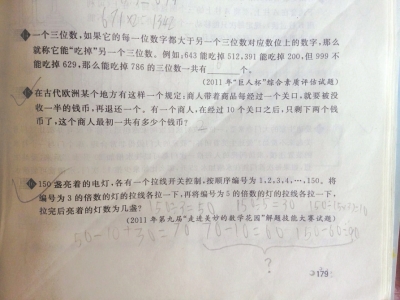 “150盞亮著的電燈,各有一個(gè)拉線開關(guān)控制,被順序編號為1,2,3,4,…,150。將編號為3的倍數(shù)的燈的拉線各拉一下,再將編號為5的倍數(shù)的拉線各拉一下,拉完后亮著的燈數(shù)為幾盞?”這是一道考公因數(shù)和公倍數(shù)的思維數(shù)學(xué)題,今年暑假,才上完三年級的羅弋在做四年級的數(shù)學(xué)競賽題集《培優(yōu)新幫手》時(shí)遇到此題,算出答案“90”與標(biāo)準(zhǔn)答案“80”不符,媽媽陳群只當(dāng)兒子錯(cuò)了。