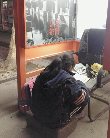 照片上這個四面漏風的電話亭,是嘉興12歲女孩曉華的“書房”,一把舊椅子當書桌,沙發(fā)坐墊當凳子,每天借著昏暗的照明燈看書做作業(yè)。