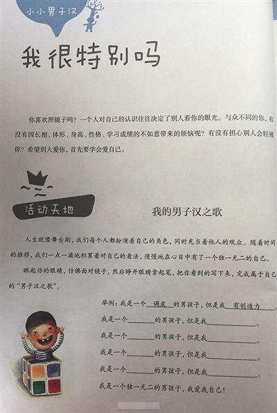 據(jù)上海教育出版社官方微信介紹,《小小男子漢》這本教材共分六個(gè)篇章。第一課“我是男孩”,主要幫助男生理解男孩和女孩究竟有哪些不同;第二課“擁抱我自己”,主要幫助男生理解什么樣的男孩算得上“酷”。第三課“好想長(zhǎng)大”,理解“為什么男子漢要有擔(dān)待?”等。