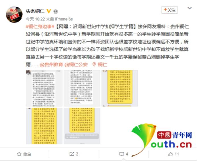 今天上午,記者聯(lián)系當(dāng)?shù)亟逃衷儐柺欠裾莆铡皩W(xué)籍保留費(fèi)”的相關(guān)情況,教育局辦公室工作人員表示,教育局昨天下午便收到消息,并于今天上午由正副局長(zhǎng)帶隊(duì)前往新世紀(jì)中學(xué)調(diào)查情況,調(diào)查結(jié)果會(huì)交給沿河縣委宣傳部。今天下午,記者聯(lián)系宣傳部,工作人員表示,新世紀(jì)中學(xué)已將所收“學(xué)籍保留費(fèi)”退還給學(xué)生家長(zhǎng),常務(wù)校長(zhǎng)羅元慶被教育局嚴(yán)肅批評(píng),并被學(xué)校董事會(huì)解除職務(wù)。