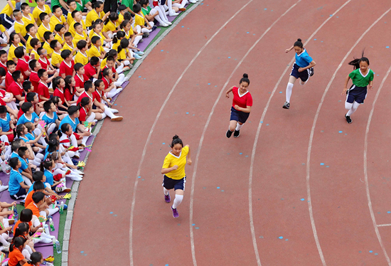 2019年6月6日,河北秦皇島,海港區(qū)新一路小學(xué)學(xué)生在全國(guó)學(xué)校體育聯(lián)盟(教學(xué)改革)海港區(qū)實(shí)驗(yàn)校階段性成果展示活動(dòng)中表演趣味比賽項(xiàng)目。視覺中國(guó)供圖