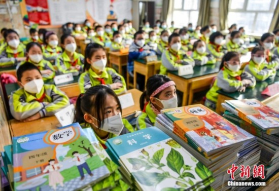 資料圖:新疆烏魯木齊市第四十二小學,學生們等待領(lǐng)取新課本。中新社記者 劉新 攝