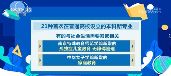 21種首次在普通高校設(shè)立的本科新專業(yè),有的與社會生活需要緊密相關(guān),比如南京特殊教育師范學(xué)院新增的孤獨(dú)癥兒童教育、無障礙管理,中華女子學(xué)院新增的家庭教育;有的與城鄉(xiāng)建設(shè)緊密相關(guān),比如海南大學(xué)新增的鄉(xiāng)村治理,北京林業(yè)大學(xué)新增的國家公園建設(shè)與管理;還有的與前沿技術(shù)發(fā)展緊密相關(guān),比如,清華大學(xué)新增的地球系統(tǒng)科學(xué),華南理工大學(xué)新增的生物材料,東南大學(xué)新增的未來機(jī)器人、電動載運(yùn)工程。