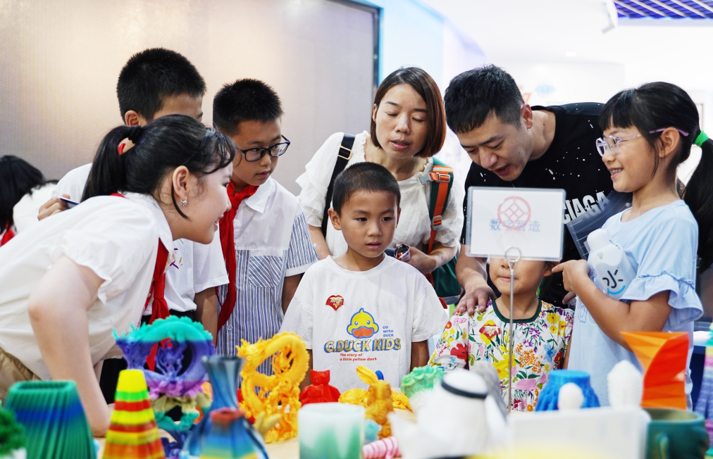 成都七中初中附屬小學(xué)一年級(jí)新生在學(xué)校人工智能館觀看3D打印機(jī)打印的作品。新華社記者邢拓 攝