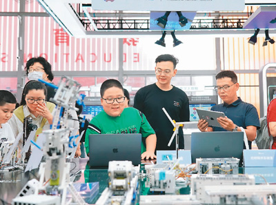 圖為在首鋼園教育服務(wù)專題展區(qū),小朋友在體驗(yàn)智能硬件編程作品。