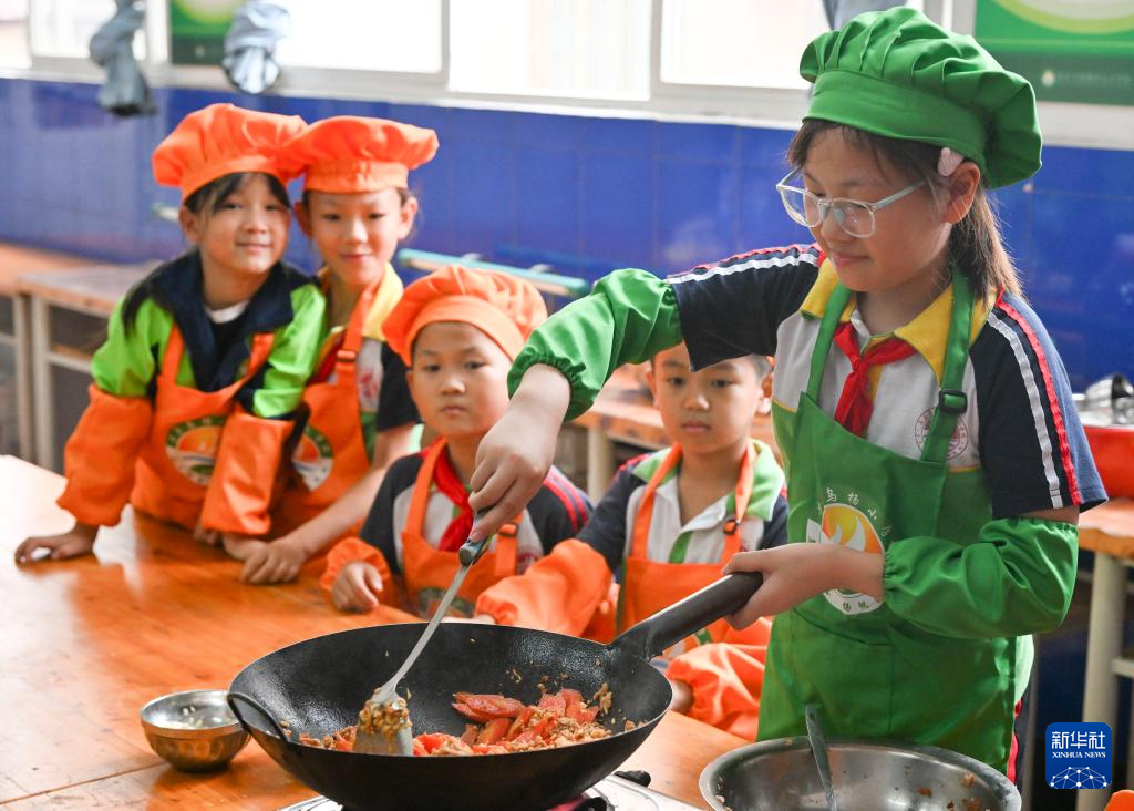 9月20日,重慶市忠縣烏楊小學(xué)廚藝社團(tuán)的學(xué)生在學(xué)習(xí)、體驗(yàn)炒菜。