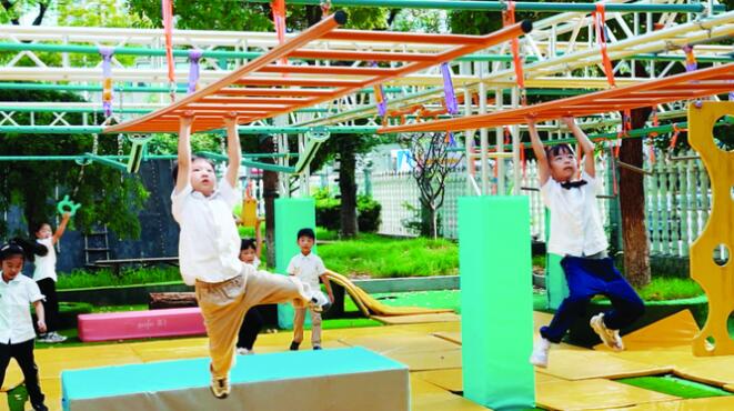 常州市五星幼兒園的負(fù)責(zé)人王艷表示,有一次同事將幾條外國(guó)幼兒園、小學(xué)低年級(jí)年齡段孩子進(jìn)行體能訓(xùn)練的視頻發(fā)了過(guò)來(lái),視頻上的孩子能夠完成跳鞍馬、手倒立行走等動(dòng)作?!坝谑牵覀兘Y(jié)合孩子們的意見,邀請(qǐng)專家共同繪制賽道構(gòu)思圖,將平衡、走、跑、跳、攀爬、懸掛等動(dòng)作元素融為一體,打造出一個(gè)綜合性的體能游戲賽道?!?/p>