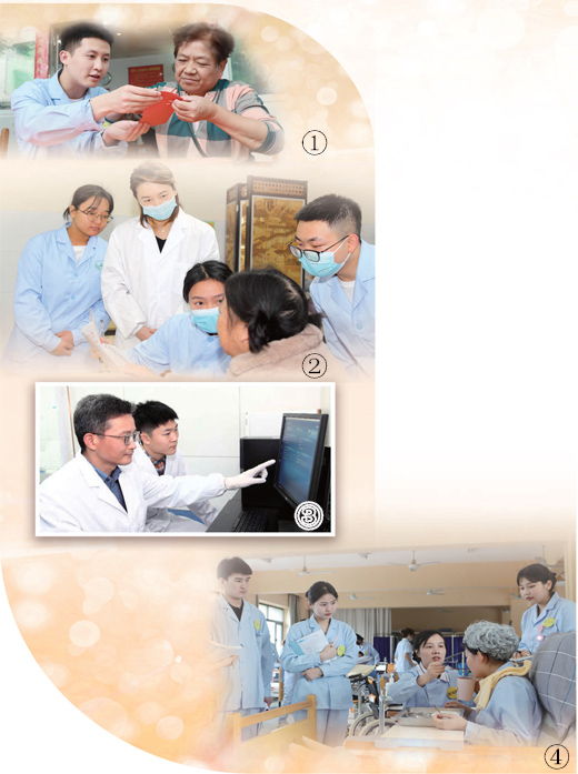 圖④:長(zhǎng)沙民政職業(yè)技術(shù)學(xué)院智慧健康養(yǎng)老教師團(tuán)隊(duì)成員、主管護(hù)師謝海艷(右三)在實(shí)訓(xùn)室給學(xué)生講授老年人生活照護(hù)技術(shù)。人民日?qǐng)?bào) 記者 王云娜攝