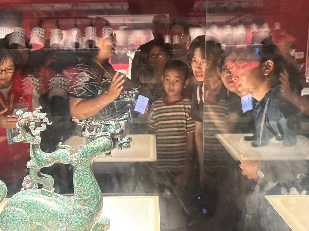 7月21日,游客在河南博物院觀看春秋時(shí)期神獸造型的樂(lè)器支架。(新華社記者翟翔 攝)