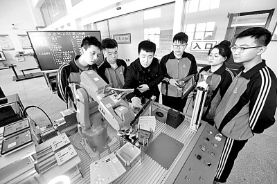 2023年3月28日,在河北省興隆縣職教中心,學(xué)生正進行工業(yè)機器人應(yīng)用實訓(xùn)。 新華社發(fā)
