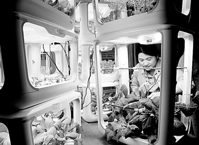 2023年5月13日,上海職業(yè)教育活動周,上海農(nóng)林職業(yè)技術(shù)學(xué)院的教師展示智能種植箱里的綠植。 新華社發(fā)