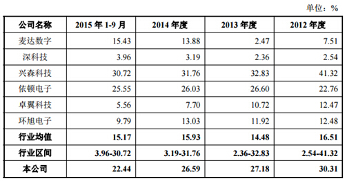 招股書顯示,易德龍負債水平偏高,流動負債占比超過95%,面臨較大的短期償債風險。而除了償債風險外,公司主營業(yè)務(wù)毛利率在報告期內(nèi)持續(xù)下降,2012年為30.31%,到2015年9月末已降至22.44%,而同時期內(nèi)行業(yè)銷售毛利率均值基本穩(wěn)定在27%左右。