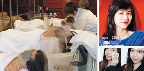 今年3月,在首爾新沙洞林蔭道,中國“網(wǎng)紅”們正在接受愛茉莉太平洋用韓方洗發(fā)水產(chǎn)品進行的頭皮護理。右上方的圖片,是papi醬上月16日在上海進行的粉絲見面會海報。下方的圖片是“網(wǎng)紅”周倩晗今年3月在自己微博上發(fā)布的韓國化妝品體驗后記。