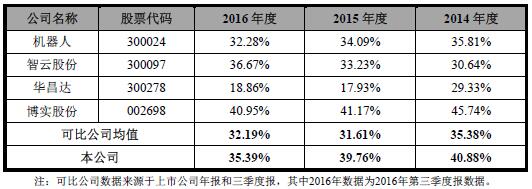2014年至2016年,同行業(yè)上市公司綜合毛利率均值分別為35.38%、31.61%、32.19%。克來機電綜合毛利率高于可比公司均值。