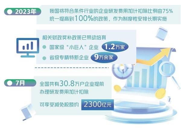 “為切實(shí)保證這一新的惠企政策落實(shí)到位,稅務(wù)部門依托稅收大數(shù)據(jù)篩選符合條件的企業(yè),定向開展政策精準(zhǔn)推送和宣傳輔導(dǎo),確保企業(yè)‘知曉政策’;會同科技部門及時(shí)發(fā)布《研發(fā)費(fèi)用加計(jì)扣除政策執(zhí)行指引2.0》,細(xì)化政策口徑,確保企業(yè)‘會用政策’;第一時(shí)間優(yōu)化升級征管系統(tǒng),改進(jìn)電子稅務(wù)局功能,讓納稅人‘足不出戶’即可快捷辦理,確保企業(yè)‘用好政策’?!眹叶悇?wù)總局新聞發(fā)言人、辦公廳主任黃運(yùn)介紹。從7月份政策落實(shí)情況看,全國共有30.8萬戶企業(yè)提前辦理研發(fā)費(fèi)用加計(jì)扣除,可享受減免稅額約2300億元。