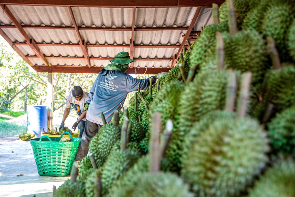 沙西通果園的榴蓮被采摘后,很快被運到附近一家加工廠。這里,工人們忙碌地對新鮮榴蓮進行分揀、稱重、打包、裝車。