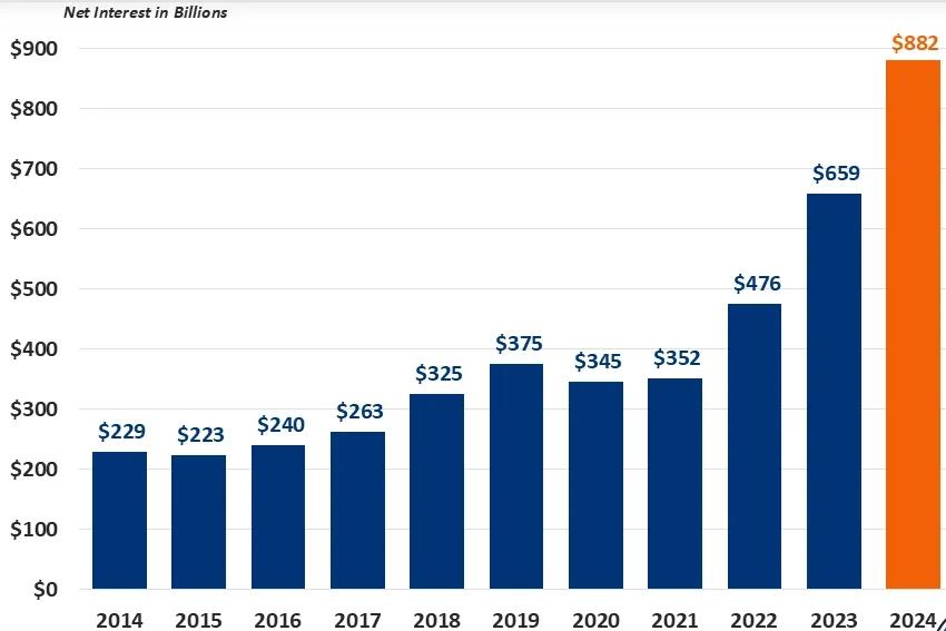 根據(jù)美國財(cái)政部11月20日公布的數(shù)據(jù),2024年美國聯(lián)邦政府僅用以償還美債利息的支出就達(dá)到了8820億美元。相較2023年6590億美元的利息支出,2024年美債利息支出增長率達(dá)33.8%。