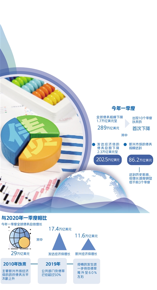 日前,國際金融協(xié)會(huì)發(fā)布了最新的全球債務(wù)監(jiān)測報(bào)告。好消息是全球債務(wù)規(guī)模在2021年一季度出現(xiàn)10個(gè)季度以來的首次下降;壞消息是全球債務(wù)規(guī)模體量巨大、償債能力不均衡等問題依然存在。
