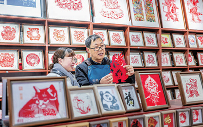 安徽淮北市濉溪縣古城,剪紙非遺代表性傳承人在介紹剪紙技藝。