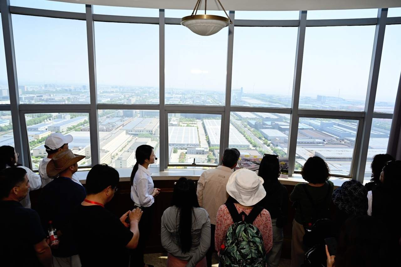 通過城市綠色觀景臺,采訪團(tuán)成員們得以在空中觀景平臺俯瞰尖山全景,光伏發(fā)電板在陽光的照耀下熠熠生輝;不遠(yuǎn)處,風(fēng)力發(fā)電機的巨大葉片也在悠悠轉(zhuǎn)動。這一光伏發(fā)電與風(fēng)力發(fā)電協(xié)同運作的景象被毫無保留地盡收眼底。