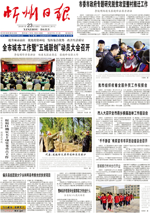 4月22日,忻州市召開(kāi)會(huì)議,動(dòng)員全市開(kāi)展“五城聯(lián)創(chuàng)”工作。提出了要以建設(shè)宜居忻州、造福人民群眾為目的、以“創(chuàng)衛(wèi)”為基礎(chǔ)、以“創(chuàng)園”為重點(diǎn)的創(chuàng)建國(guó)家衛(wèi)生城市、省級(jí)園林城市、國(guó)家環(huán)保模范城市、省級(jí)智慧城市、省級(jí)文明城市。同時(shí)宣布成立了“五城聯(lián)創(chuàng)”總指揮部,全面推進(jìn)了“五城聯(lián)創(chuàng)”工作。9月2日和12月9日,我市相繼召開(kāi)忻州城區(qū)創(chuàng)建國(guó)家衛(wèi)生城市大會(huì)和再動(dòng)員大會(huì),對(duì)創(chuàng)衛(wèi)工作再部署、任務(wù)再明確,進(jìn)一步動(dòng)員市、區(qū)各級(jí)各部門提高認(rèn)識(shí),明確責(zé)任,強(qiáng)化措施,狠抓落實(shí),確保城區(qū)順利創(chuàng)建國(guó)家衛(wèi)生城市。目前中心城區(qū)創(chuàng)建國(guó)家衛(wèi)生城市通過(guò)專家暗訪,14個(gè)縣(市、區(qū))實(shí)現(xiàn)創(chuàng)衛(wèi)全覆蓋,全省唯一。中心城區(qū)和原平、五臺(tái)、寧武、岢嵐創(chuàng)建省級(jí)園林城市通過(guò)省考核驗(yàn)收,數(shù)量全省第一。加強(qiáng)大氣污染防治,全年二級(jí)以上天氣同比增加9天,是全省完成年度目標(biāo)任務(wù)的3個(gè)市之一。(2016年4月23日《忻州日?qǐng)?bào)》)