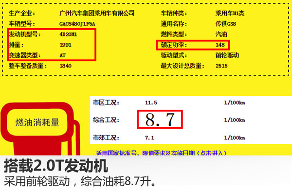 動力方面,從國家工信部公布的信息可知,廣汽傳祺GS8將搭載一臺型號為4B20M1的2.0升直列四缸渦輪增壓發(fā)動機,額定功率148千瓦,匹配6速自動變速箱。百公里綜合油耗分別為:兩驅(qū)車型8.7升,四驅(qū)車型9.3升。