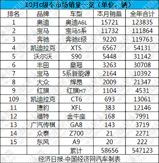 統(tǒng)治C級車市場近30年的奧迪A6L,即便處在產(chǎn)品生命期末端,依舊不減“老大”的霸氣。數(shù)據(jù)顯示,A6L在10月份的銷量達15721輛,勇奪單月銷量冠軍;前10個月的累計銷量為123835輛,趕超奔馳E級,重新收獲C級車市場的銷量冠軍。