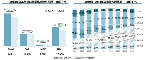 再以車型分類來看,2018年,三大進(jìn)口車型的銷量出現(xiàn)明顯分化。其中,轎車銷量增長3.2%,是唯一保持增長的車型;SUV的銷量占比雖達(dá)到57.7%,但其銷量卻出現(xiàn)15.6%的明顯下滑;MPV更是大幅下降32.8%。此外,進(jìn)口車排量下移也成為趨勢,1.5升-2.0升排量進(jìn)口車的銷量占比從2014年的34.6%升至46.1%,達(dá)到較高水平;與之相對,3.0升-4.0升排量進(jìn)口車銷量則出現(xiàn)較明顯的下滑。