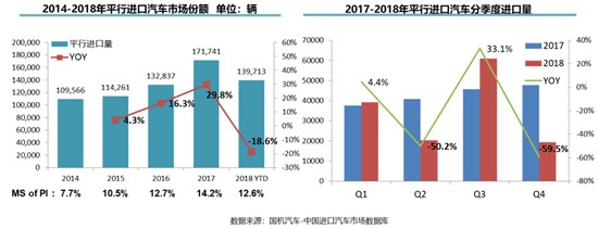 此外,2018年,平行進(jìn)口汽車銷量出現(xiàn)了5年來的首次下滑,且市場波動明顯。2018年,平行進(jìn)口車銷量占進(jìn)口車總銷量的12.6%,達(dá)13.97萬輛,同比下滑18.6%,下滑幅度遠(yuǎn)超進(jìn)口車市場整體表現(xiàn)。