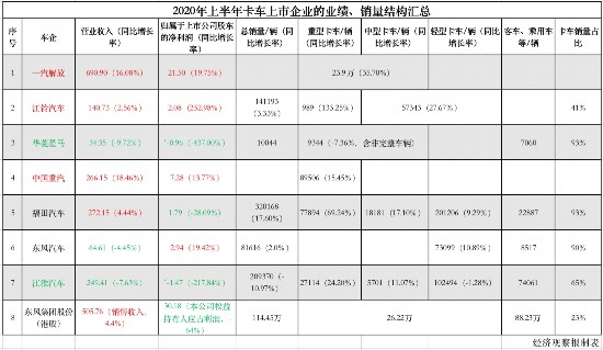 2020年上半年主要卡車上市企業(yè)業(yè)績(jī)及銷量情況