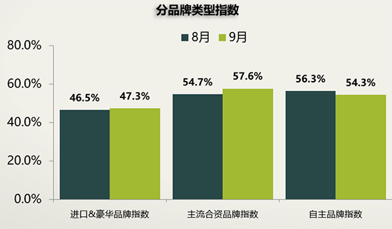 品牌類型方面,9月份進(jìn)口&豪華品牌、主流合資品牌指數(shù)環(huán)比上升,自主品牌指數(shù)環(huán)比下降。樊宇表示,豪華品牌繼續(xù)領(lǐng)跑,庫存處于警戒線以下;合資品牌則出現(xiàn)明顯的分化,庫存壓力上升;自主品牌市場份額小幅回升,銷量穩(wěn)定增長,庫存壓力得到一定緩解。