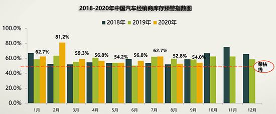 即便處于汽車市場的“金九”旺季,經(jīng)銷商的庫存壓力依然不小。昨日(10月13日),流通協(xié)會發(fā)布數(shù)據(jù)顯示,9月,國內(nèi)汽車經(jīng)銷商庫存預(yù)警指數(shù)為54.0%,較上月上升1.2個百分點(diǎn),較去年同期下降4.6個百分點(diǎn),庫存預(yù)警指數(shù)位于榮枯線之上。