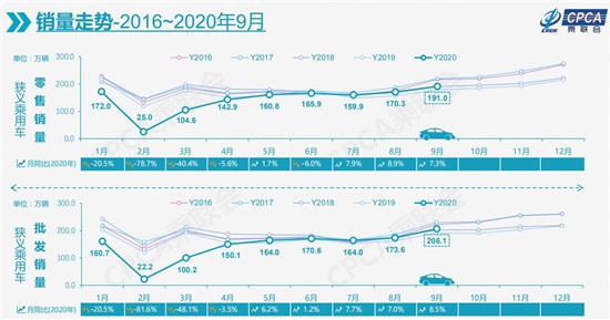 9月,國內(nèi)狹義乘用車銷量達到191.0萬輛,同比增長7.3%,三季度較去年同期實現(xiàn)約38萬輛的銷售增量;1-9月累計銷量增速下滑也收窄至12.5%,較1-8月再提升2.7個百分點。國內(nèi)乘用車市場繼續(xù)呈現(xiàn)較強的回暖趨勢。