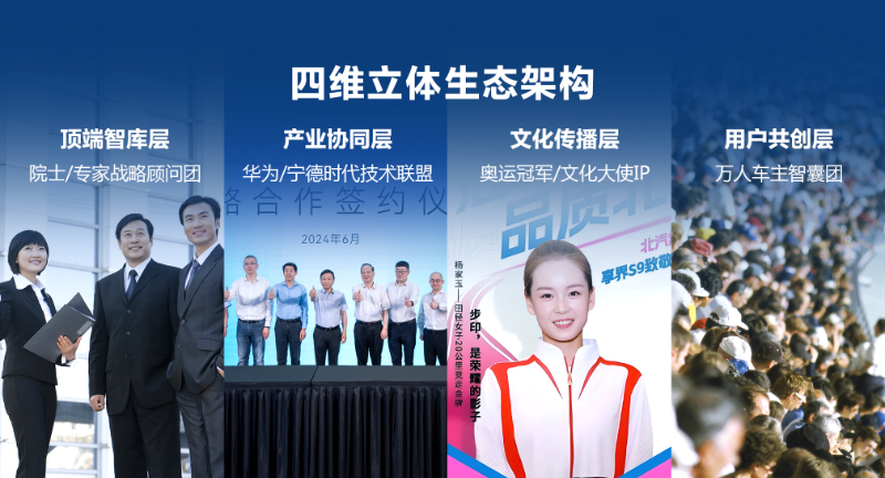 “品牌摯友計劃”是北汽集團(tuán)“品牌三年躍升行動”的重要引擎,構(gòu)建一個“四維立體生態(tài)”:頂端智庫層,邀請?jiān)菏?、專家、?jīng)濟(jì)學(xué)家組成戰(zhàn)略顧問團(tuán);產(chǎn)業(yè)協(xié)同層,與華為、寧德時代等合作伙伴共建技術(shù)品牌聯(lián)盟;文化傳播層,攜手奧運(yùn)冠軍、文化名人打造"美好出行大使"IP;用戶共創(chuàng)層,建立萬人級車主智囊團(tuán)。除了外部資源,品牌摯友計劃還將逐步拓展至20位內(nèi)部管理者及300名KOE員工。