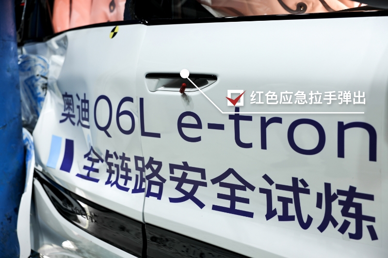 結(jié)果顯示,一汽奧迪Q6L e-tron車身結(jié)構(gòu)完整,A、B、C、D柱均未發(fā)生結(jié)構(gòu)性失效,兩次擠壓下乘員艙依然保持足夠的生存空間。安全帶正常預(yù)緊點(diǎn)爆,側(cè)氣囊、側(cè)氣簾及中央氣囊正常展開(kāi),全車假人傷害值均處于優(yōu)秀水平。電池組在遭遇“夾心式?jīng)_擊”后幾乎無(wú)變形、無(wú)位移,經(jīng)受住幾何形變與短路風(fēng)險(xiǎn)雙重考驗(yàn),未發(fā)生冒煙、起火、爆炸或電解液泄漏。高壓系統(tǒng)在毫秒級(jí)內(nèi)完成高壓斷電,有效避免短路造成熱失控風(fēng)險(xiǎn)。通過(guò)科學(xué)的走線,有效的結(jié)構(gòu)保護(hù),以及冗余的功能設(shè)計(jì),保障極限場(chǎng)景下低壓電正常工作。半隱藏式車門把手的紅色應(yīng)急拉手正常彈出,前排車門可正常打開(kāi),電動(dòng)座椅可調(diào)節(jié);車窗自動(dòng)下降,保障車內(nèi)空氣流動(dòng)。碰撞后雙閃及時(shí)開(kāi)啟,E-CALL及時(shí)啟動(dòng)并接通人工客服。從堅(jiān)若磐石的乘員艙結(jié)構(gòu),到周全可靠的碰撞后救援機(jī)制等,每一個(gè)安全細(xì)節(jié)都交出了高分答卷。