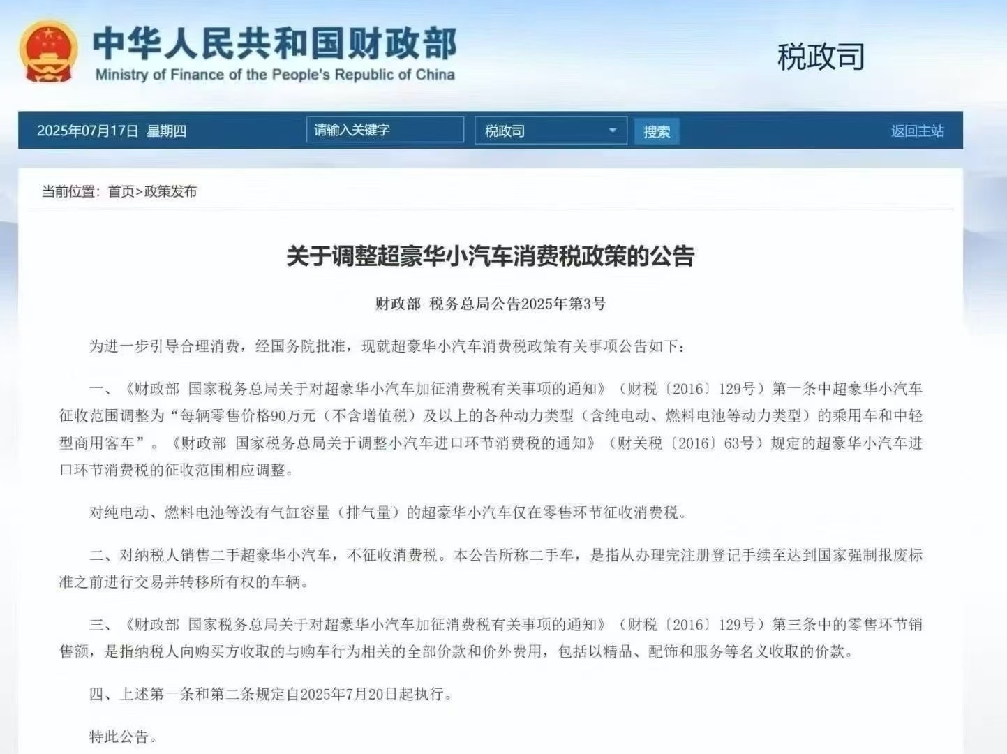 央廣網(wǎng)北京消息(記者董楠)7月17日,財(cái)政部、稅務(wù)總局聯(lián)合發(fā)布公告,對(duì)超豪華小汽車消費(fèi)稅政策作出調(diào)整。此次調(diào)整不僅將征稅門檻從130萬(wàn)元(不含增值稅)降至90萬(wàn)元,還在征稅環(huán)節(jié)、車型差異、二手車交易等方面做出明確規(guī)范,新政7月20日起正式執(zhí)行。這是2016年我國(guó)對(duì)超豪華小汽車加征消費(fèi)稅后的首次調(diào)整。