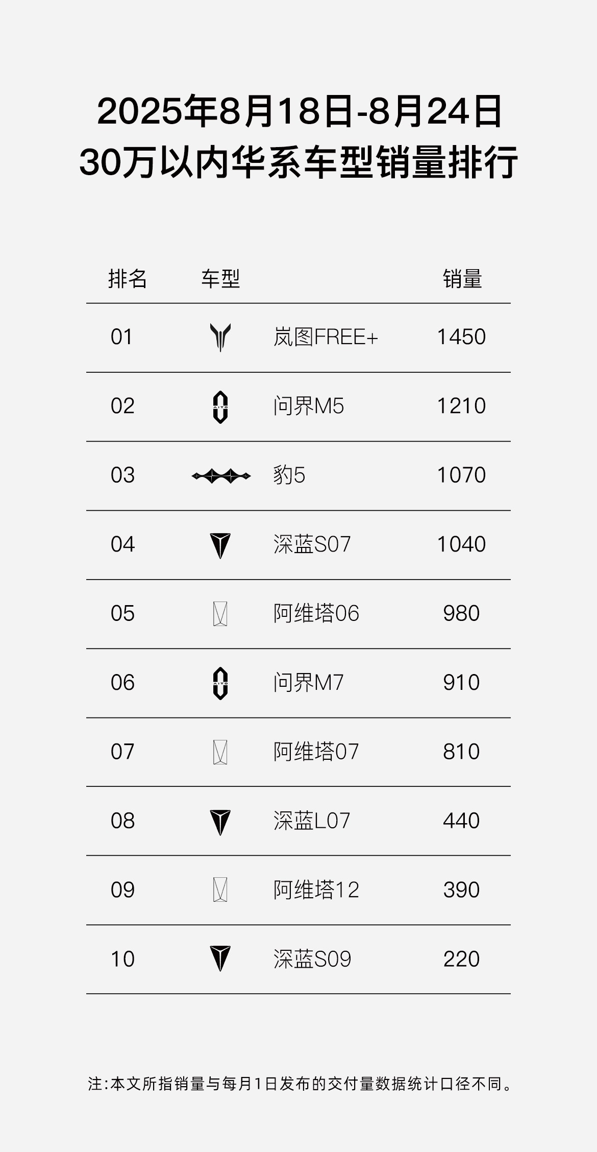 央廣網(wǎng)北京8月27日消息(記者姜鵬)8月第三周(8月18日-8月24日),嵐圖FREE+再創(chuàng)銷量佳績(jī):?jiǎn)沃茕N量達(dá)到1450輛,再次奪得第34周“30萬(wàn)內(nèi)華系車型銷冠”,并強(qiáng)勢(shì)躋身20-30萬(wàn)級(jí)混動(dòng)SUV銷量 Top2。截至8月24日,嵐圖FREE+當(dāng)月累計(jì)銷量已達(dá)4110輛,穩(wěn)坐30萬(wàn)以內(nèi)華系車型銷量Top1。