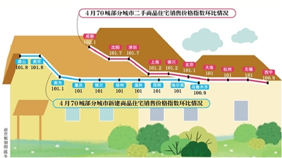 新房銷售價(jià)格環(huán)比上漲的有50城,比3月多12個(gè);二手房銷售價(jià)格環(huán)比上漲的有37個(gè),比3月多5個(gè)